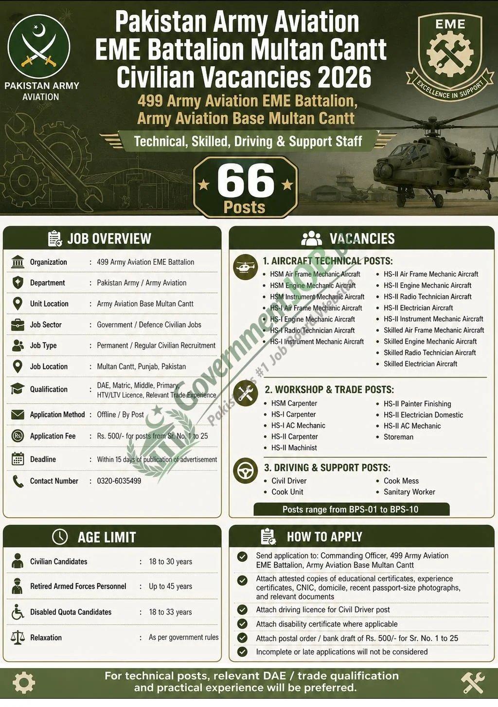 Job InformationDetailsOrganization499 Army Aviation EME BattalionDepartmentPakistan Army / Army AviationUnit LocationArmy Aviation Base Multan CanttJob SectorGovernment / Defence Civilian JobsJob TypePermanent / Regular Civilian RecruitmentJob LocationMultan Cantt, Punjab, PakistanTotal Vacancies66 PostsRequired QualificationDAE, Matric, Middle, Primary, HTV/LTV Licence, Relevant Trade ExperienceApplication MethodOffline / By PostApplication FeeRs. 500/- for posts from Sr. No. 1 to 25DeadlineWithin 15 days of publication of advertisementContact Number0320-6035499AddressCommanding Officer, 499 Army Aviation EME Battalion, Army Aviation Base Multan Cantt