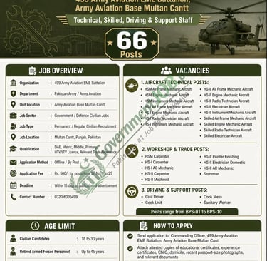 499 Army Aviation EME Battalion, Army Aviation Base Multan Cantt has announced new civilian government jobs 2026 for eligible Pakistani candidates. Applications are invited for multiple technical, aviation maintenance, skilled trade, clerical/store, driving, cooking and support staff vacancies. These positions are suitable for candidates having relevant technical qualification such as DAE, Matric, Middle, Primary, HTV/LTV driving licence, trade experience and practical skill in aircraft maintenance or workshop-related fields. Candidates who meet the required qualification, experience, age limit and quota conditions should submit their applications to the concerned unit within the deadline mentioned in the advertisement.