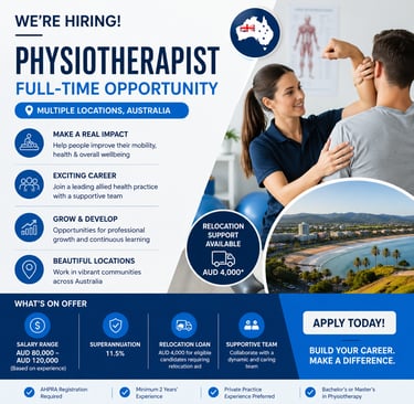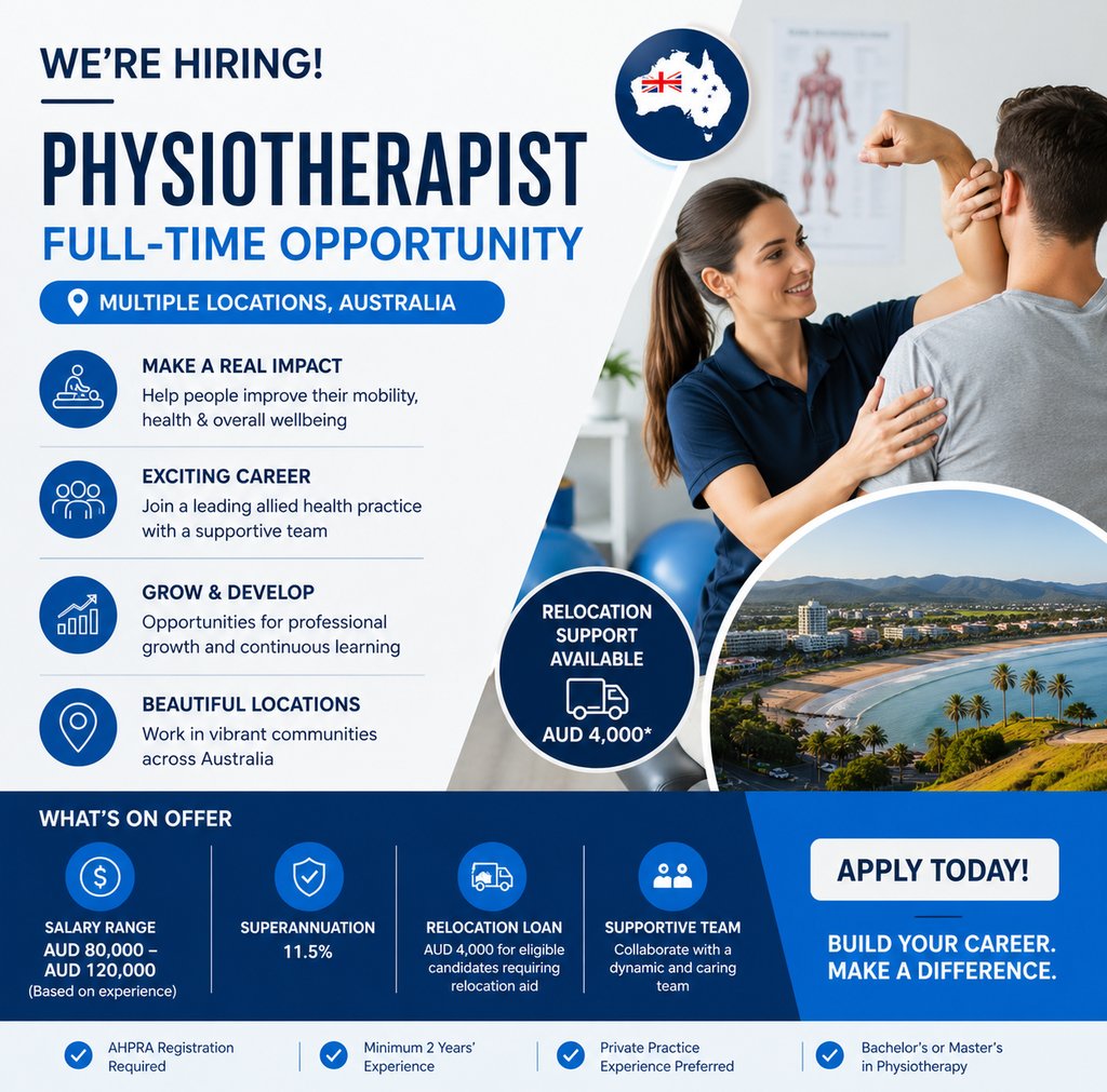 Explore an exciting opportunity for experienced physiotherapists to work in Australia with a leading allied health practice in Mackay, QLD. This full-time role offers a competitive salary of AUD 80,000–120,000, relocation support, and strong career growth potential. Ideal for AHPRA-registered professionals passionate about improving patient mobility, health, and overall wellbeing in a supportive clinical environmention.